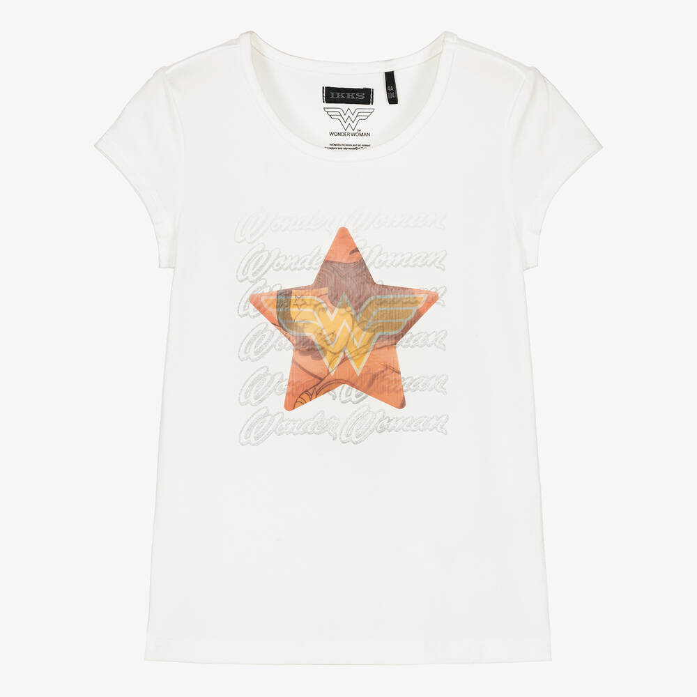 Girls white T-shirt by IKKS, with a lenticular Wonder Woman print. It is made in soft and stretchy jersey, and has capped sleeves.
