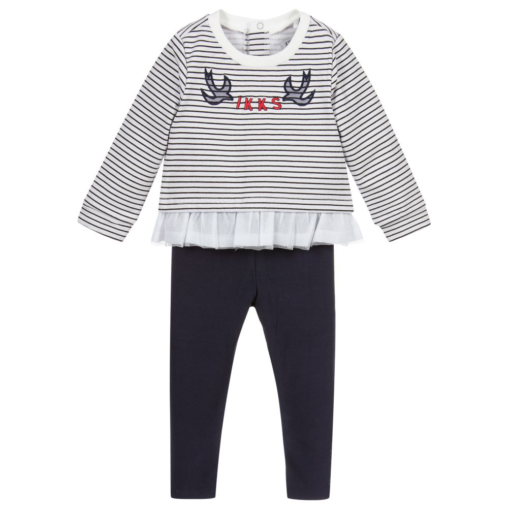 Little girls white and navy blue leggings set by IKKS, made in soft cotton jersey. The white top has black printed stripes, a navy blue and red embroidered logo and a ribbed neck. There is a soft cotton lined, ruffled white tulle trim around the hem. The navy blue leggings are soft and stretchy with ' IKKS minuit a Paris' printed in grey on one leg.