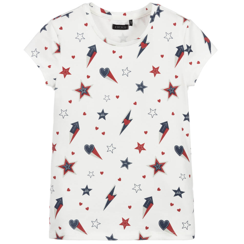 White T-shirt for girls by French brand IKKS, made in comfortable cotton jersey. It has a navy blue, red & glittery silver lightning, heart and star print.