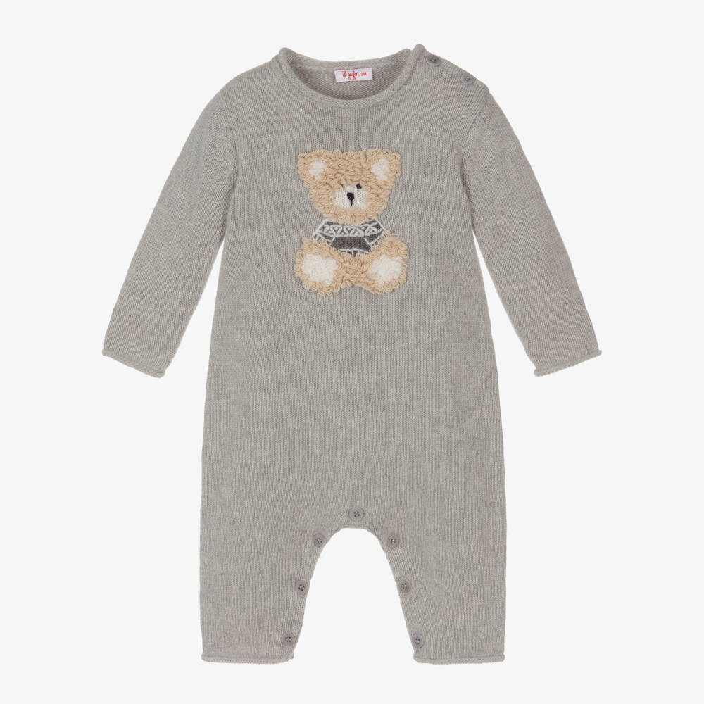 A sweet grey romper for baby boys by luxury Italian brand, Il Gufo. Ethically sourced and environmentally friendly, this romper is beautifully knitted in extra fine Merino wool. An adorable beige teddy bear is hand-stitched on the front in a looped design, and there are rolled trims. This babygrow is finished with button fastenings on the shoulders and between the legs.