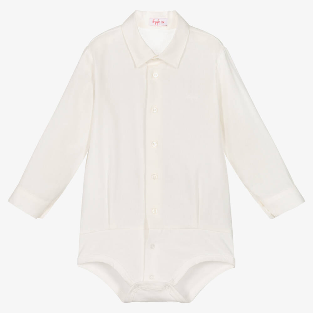 An off-white bodysuit for baby boys by luxury Italian brand Il Gufo, woven in super soft cotton. In the style of a shirt, this smart bodysuit has a pointed collar, an embroidered logo and neat pearlescent button fastenings down the front. The lower half is made from jersey for comfortable wear, and has useful popper fastenings for easy changing.