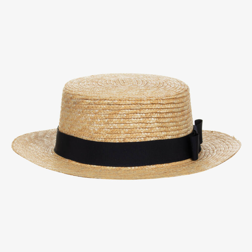 Light beige straw hat for boys and girls by Italian brand Il Gufo, in a classic boater style. It has an equally classic navy blue grosgrain ribbon trim.
