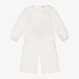 Beige trouser set for little boys and girls by luxury Italian brand Il Gufo, knitted in soft virgin wool. The top has a cute bear face embroidered on the front with a brown embroidered logo by the hem. It fastens with buttons on the back. The trousers have cosy ribbed cuffs and an elasticated waistband for a comfortable fit.