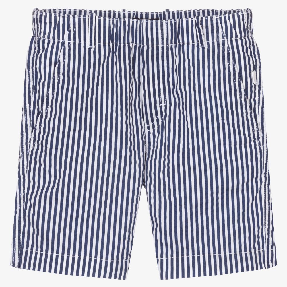 Blue and white Bermuda shorts for boys by Italian designer Il Gufo. Soft and stretchy, there are made in a lightweight cotton blend seersucker, with navy blue and white stripes and the designer's logo tab on the side seam. These comfortable shorts have an elasticated waist and three pockets.