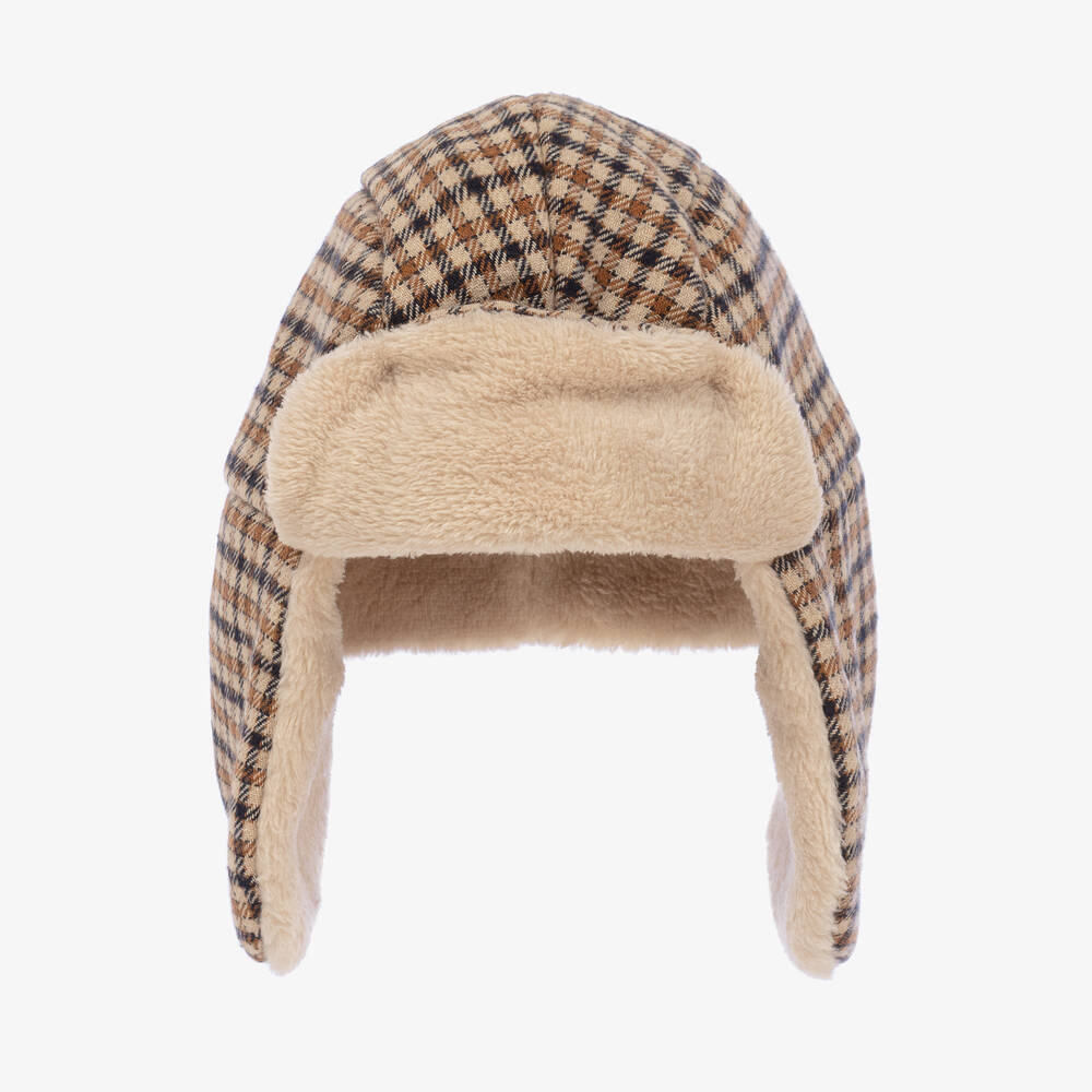 Timelessly stylish beige checked hat for boys by Italian luxury brand Il Gufo. Designed in a classic trapper style with a turned-up brim and ear flaps, this hat is lined with super soft faux fur for added warmth and comfort.