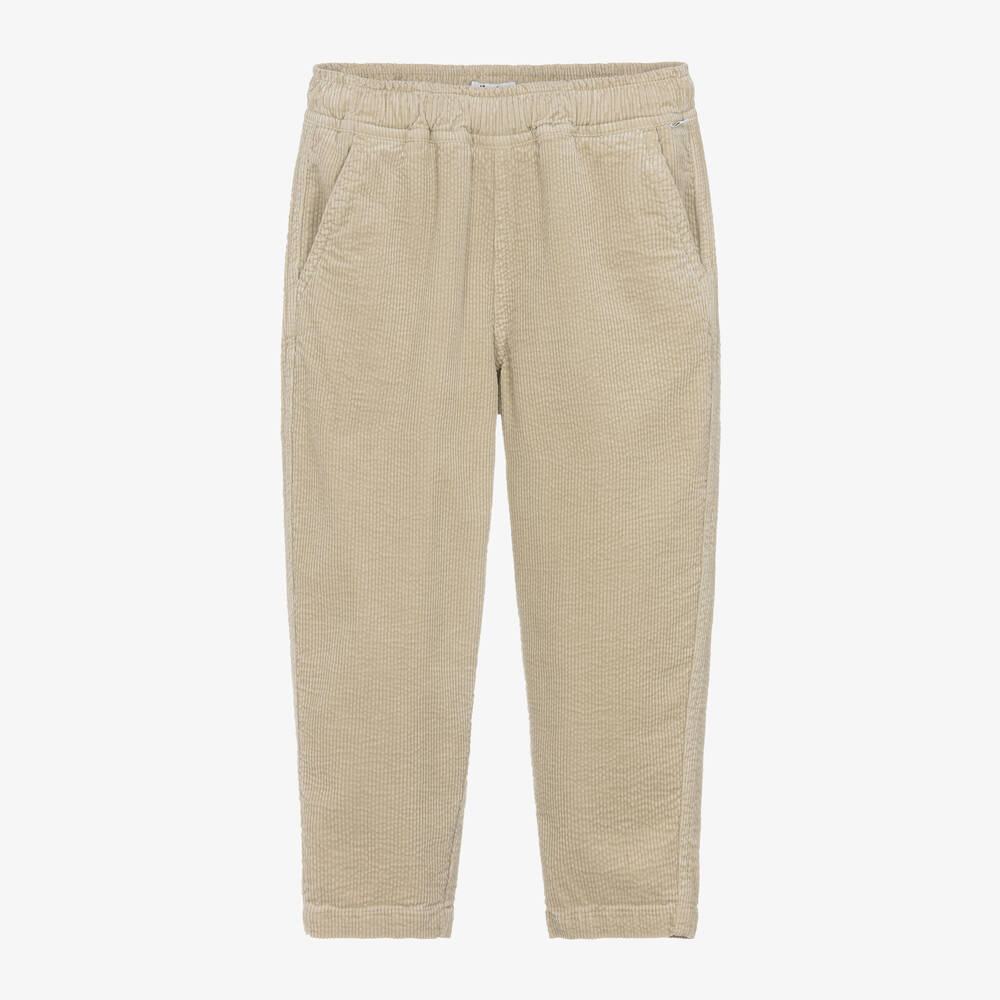 Beige trousers for boys by luxury Italian brand Il Gufo, made in soft cotton corduroy with a slight stretch for comfort. Casually styled with slanted front pockets, they have a stretchy elasticated waistband with an internal drawstring to ensure an ideal fit. Adding a signature finish, a small logo tab is sewn on the front.