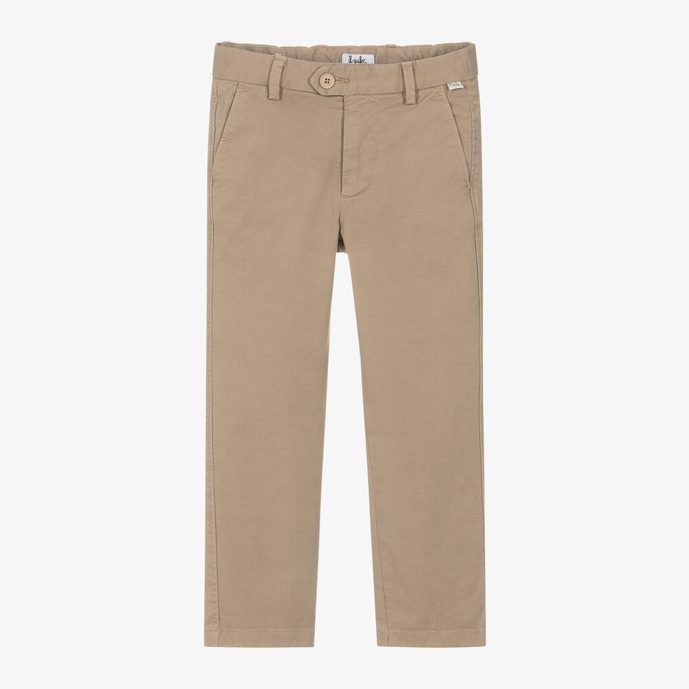 Beige trousers for boys by luxury Italian brand Il Gufo, made in soft and comfortable cotton twill. Ideal for both smart and casual occasions, they have slanted front pockets and a single pocket on the back. They fasten with a button and zip and have an adjustable waistband to ensure a great fit. For designer appeal, a small logo tab is stitched on the hip.