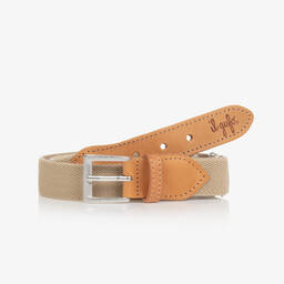 A classic beige elasticated belt for boys by Italian brand Il Gufo, with luxurious tan brown leather trims. It has a silver-tone buckle fastening and a sliding clasp to adjust to a comfortable length. Adding a timeless finishing touch, there is a subtle logo embossed on one end.