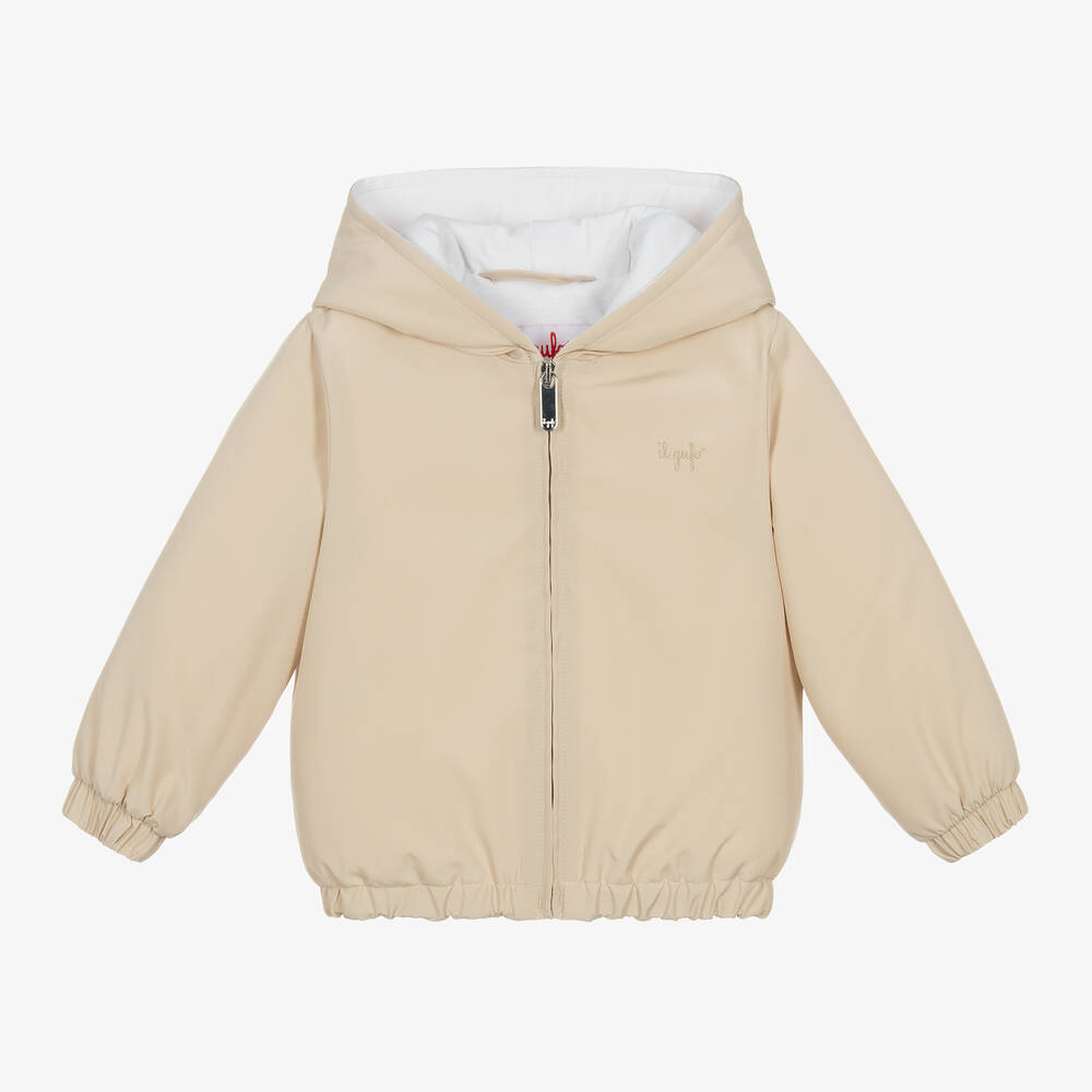 Beige hooded jacket for little boys by luxury Italian brand Il Gufo, with an embroidered logo on the chest. Silky smooth, it is lined in soft, comfortable cotton jersey and lightly padded for cosiness. A covered front zip fastening with gently elasticated cuffs and hemline help to keep out chilly winds.