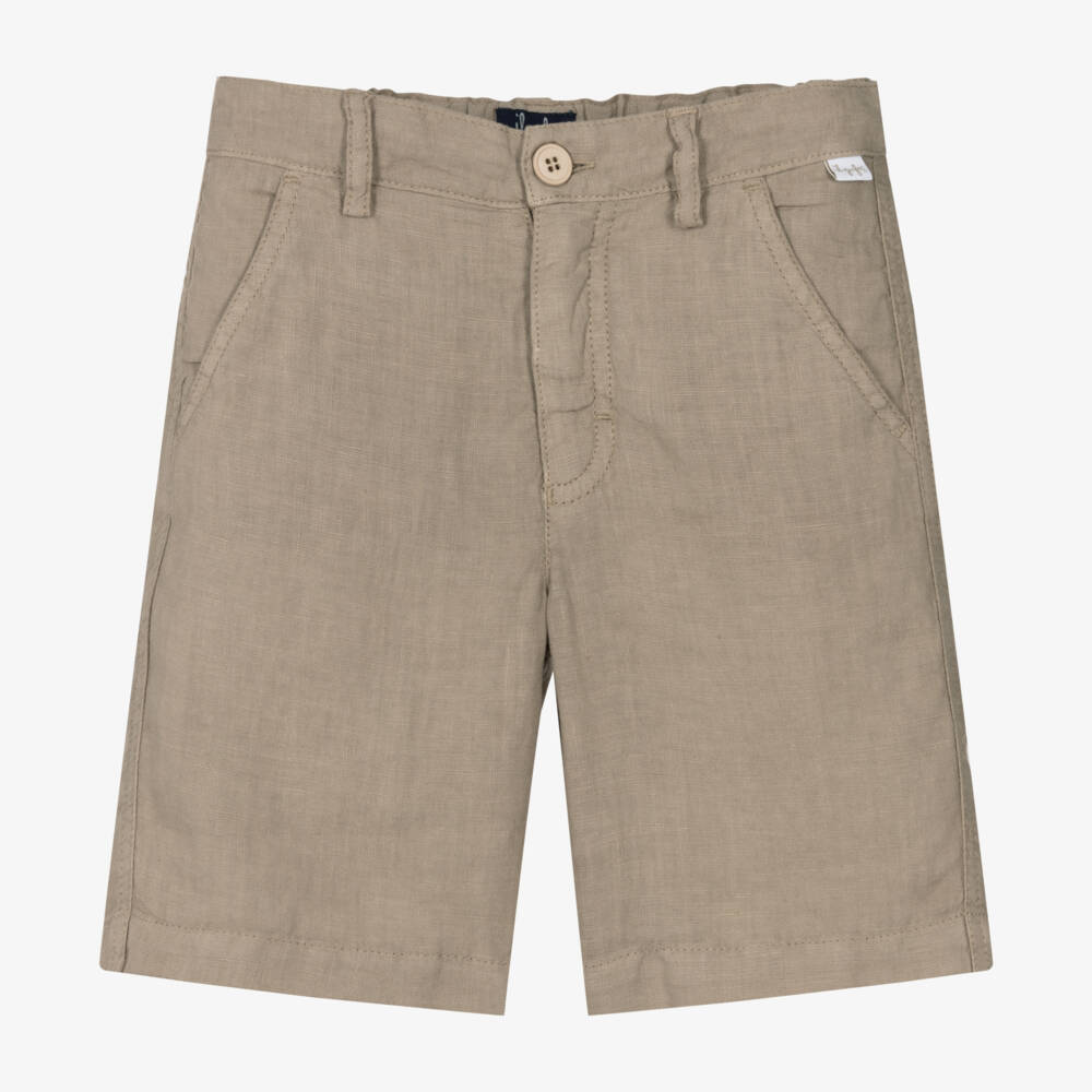 Smart casual mid-beige Bermuda shorts for boys, by luxury Italian brand Il Gufo. Made from super soft and lightweight linen, they have two pockets on the front, one buttoned pocket on the back. They fasten with a button and zip on the front, with an adjustable waist allowing a comfortable fit.