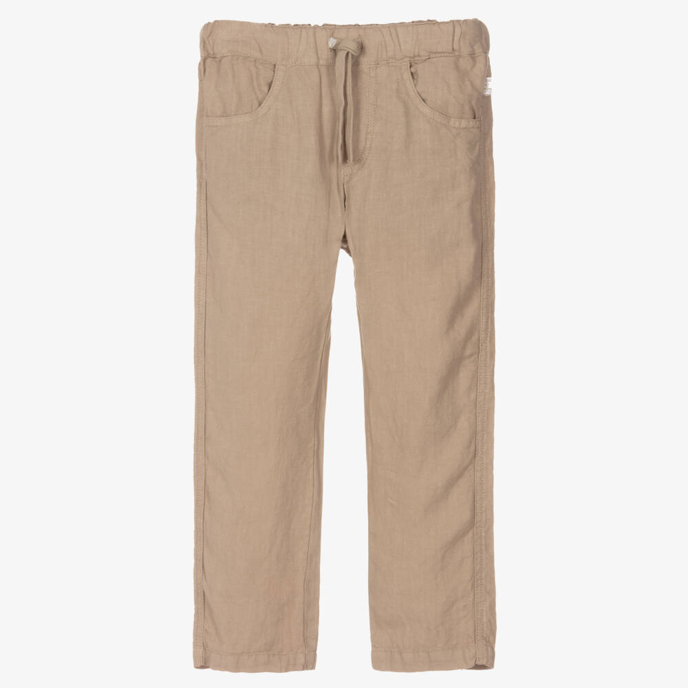 Boys beige linen trousers from luxury Italian brand Il Gufo. These lightweight trousers have a gently elasticated waist which can be adjusted with a drawstring for a secure and comfortable fit. They have four useful pockets, two on the front and two on the back and are finished with a tonal logo tab.