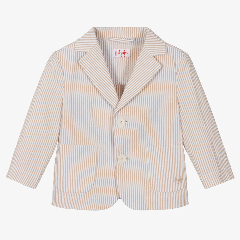 A classic beige and ivory pinstripe blazer for little boys by luxury Italian brand Il Gufo. Easy and comfortable to wear, the jacket is made in lightweight cotton seersucker and vented at the back. There are front button fastenings and subtle logo embroidery on one of the pockets.