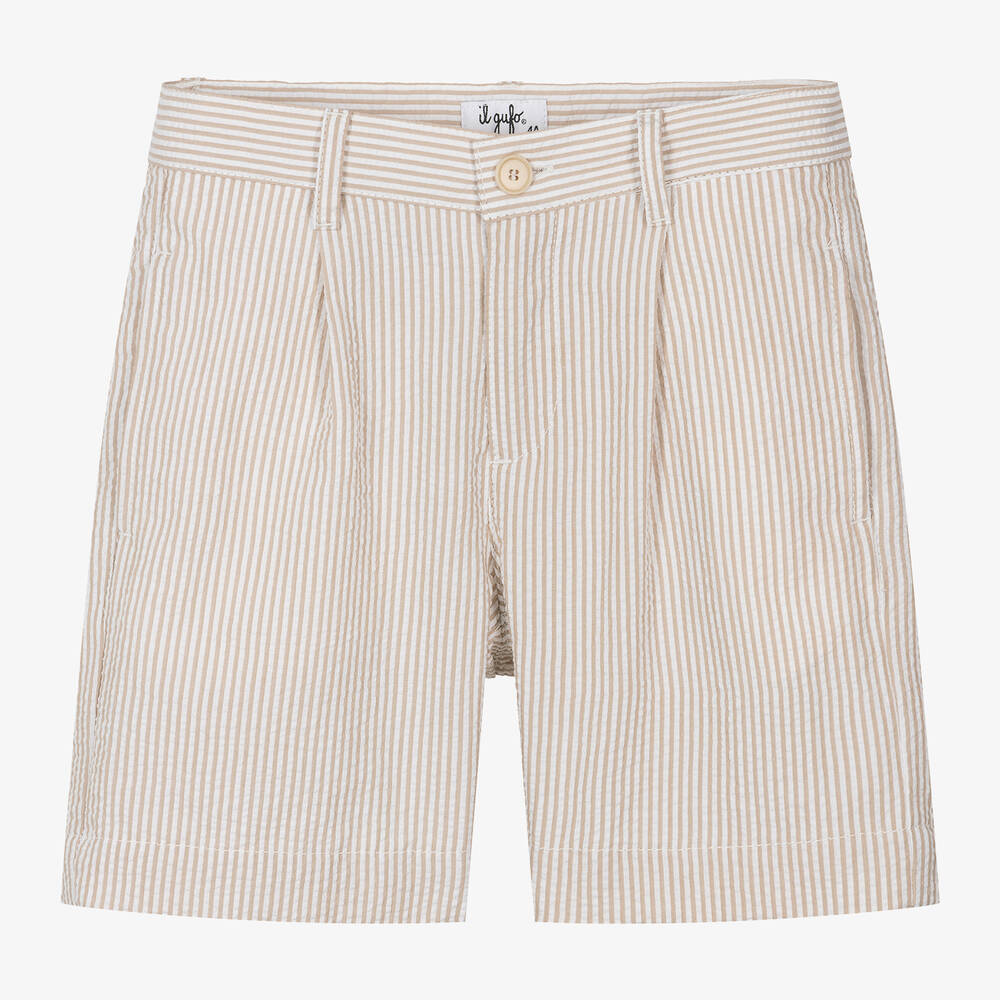 Beige and white striped Bermuda shorts for boys by Italian luxury brand Il Gufo. Cool and comfortable for warmer weather, they are made in lightweight cotton seersucker. They have an adjustable waist for an ideal fit, with a button and zip fastening on the front. There are concealed side seam pockets and an additional buttoned pocket on the back.