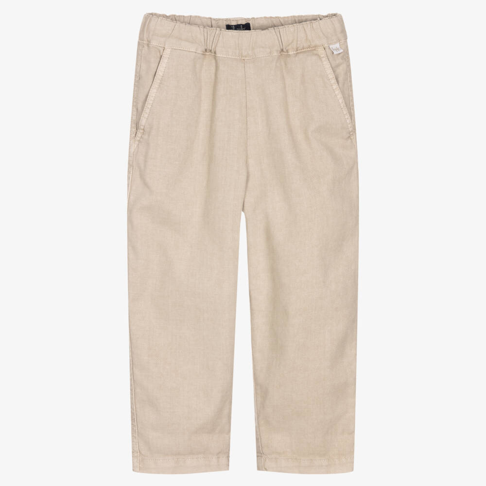 Casual beige trousers for boys from luxury brand Il Gufo, woven in a mid-weight cotton and linen blend. They have an elasticated waistband for comfort and an internal drawstring means they can be adjusted for a better fit. Simple yet stylish, there are two front pockets and the legs slightly taper at the bottom for a classic finish.