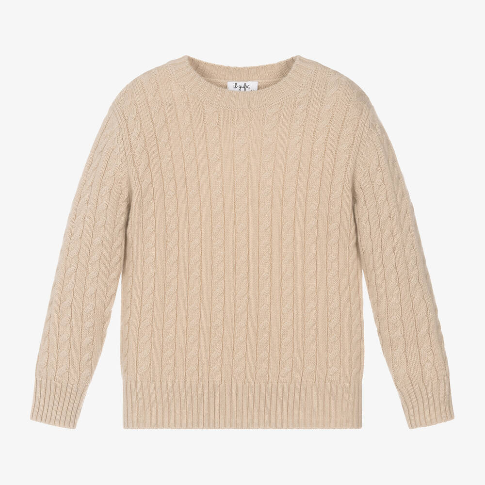 A classic beige cable knit sweater for boys from luxury Italian brand, Il Gufo. This timeless knitwear piece is crafted from virgin wool, which is ethically sourced and environmentally friendly. Simple and understated, it is styled with a round neckline, long sleeves and ribbed trims.