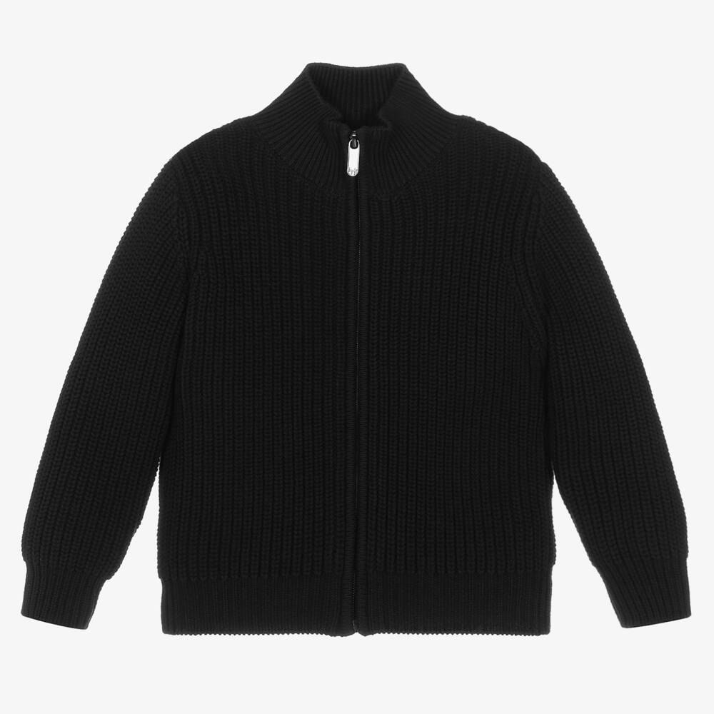 A classic black ribbed cardigan for boys by luxury Italian brand Il Gufo, knitted in soft organic cotton. Great for layering, this top has a warm high neck and fastens neatly with a zip.