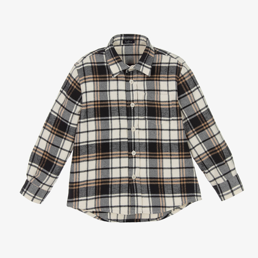 A navy blue and ivory flannel shirt for boys, by the luxury Italian brand Il Gufo. In a classic check design, this casual shirt has a patch pocket on the front and fastens neatly with buttons.