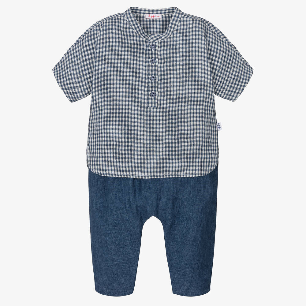 A lovely blue shirt and trousers set for little boys by luxury Italian brand Il Gufo, made in cool and comfortable linen. The gingham shirt is in a classic collarless style and fastens with buttons on the front. The denim-look trousers are in a easy-to-wear baggy style and have a gently elasticated waist.