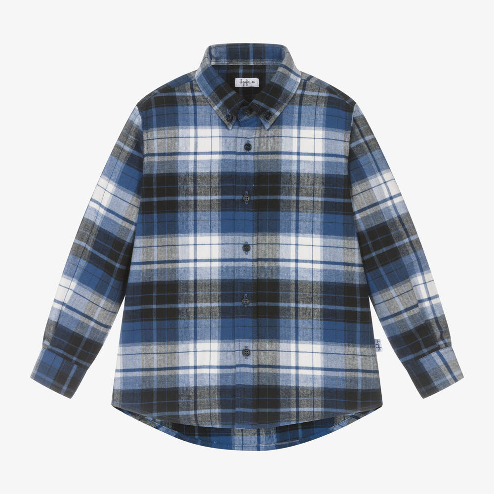 A blue and white checked shirt for boys by luxury Italian brand Il Gufo, made in super soft, brushed cotton in a herringbone weave. This classic smart-casual style has a button-down collar and gently curved hemline. The front and long-sleeved cuffs fasten with buttons.