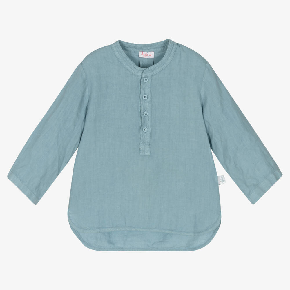 Little boys light blue shirt by luxury brand Il Gufo, woven in beautifully lightweight, sheer linen. This timeless style has a smart collarless trim and tonal button fastenings on the front. It has a curved hem and discreet tonal logo badge on the side seam, offering sophisticated fashion for your little one.