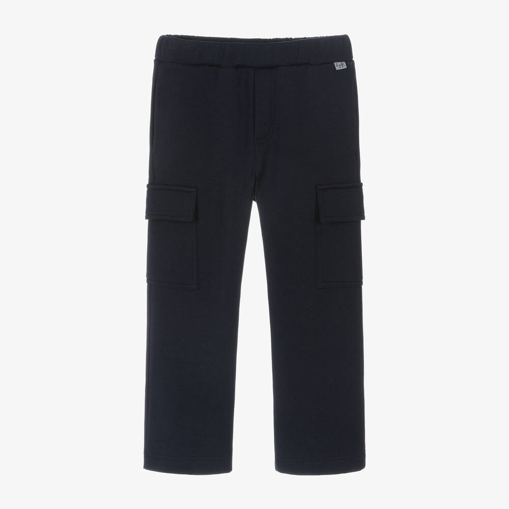 Navy blue cotton joggers for boys by Il Gufo, with cargo pockets on the legs along with side seam pockets. Made in soft, comfortable, mid-weight jersey with a cosy, fleecy inside, they have an internal drawstring waist for a great fit.