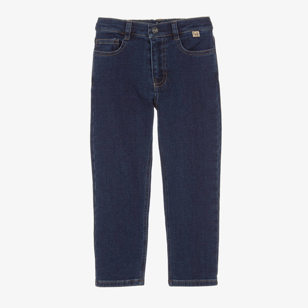 Blue mid-wash jeans for boys by luxury Italian brand Il Gufo, made in soft cotton denim with a hint of stretch. In a classic five pocket style and fastening with a zip and branded popper, they have an adjustable waistband that is gently elasticated around the back.