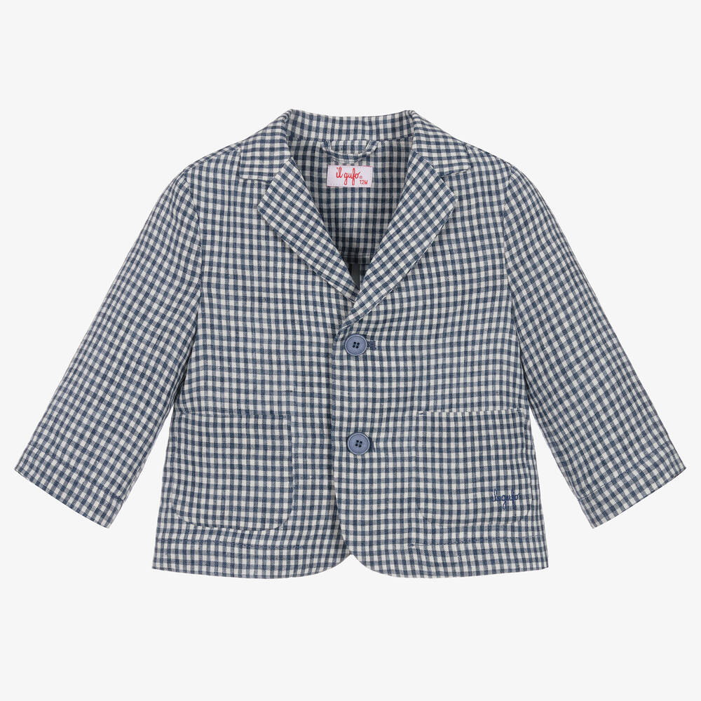Classic smart-casual blue and white gingham blazer for little boys by luxury Italian brand Il Gufo. Made in cool, lightweight linen, it has an embroidered blue logo on one of the front patch pockets. There are button fastenings on the front and decorative buttons on the cuffs.