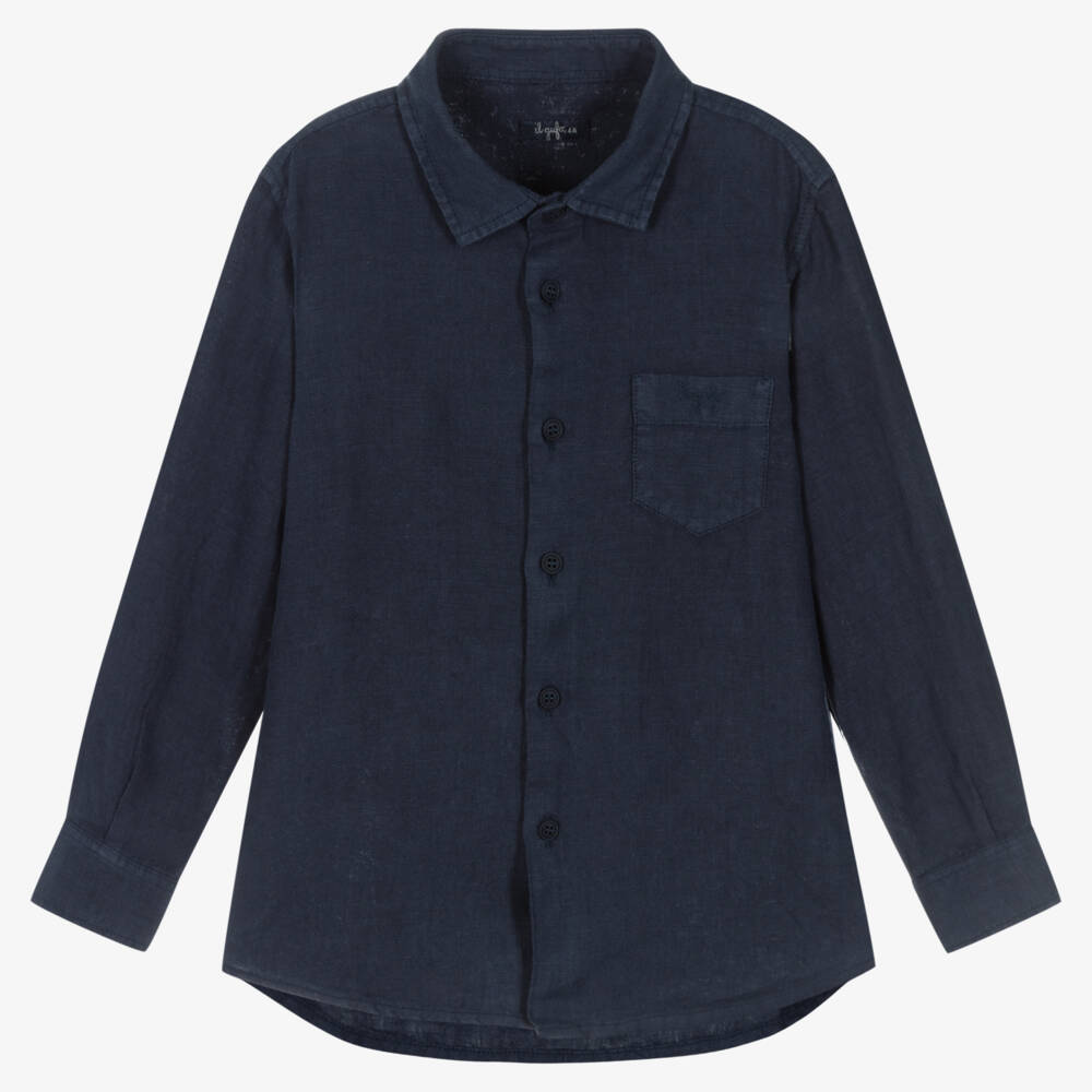 From luxury Italian brand Il Gufo, a navy blue shirt for boys, made in lightweight linen. It fastens with buttons on the front and there is a chest pocket embroidered with the brand's logo for a subtle designer touch.