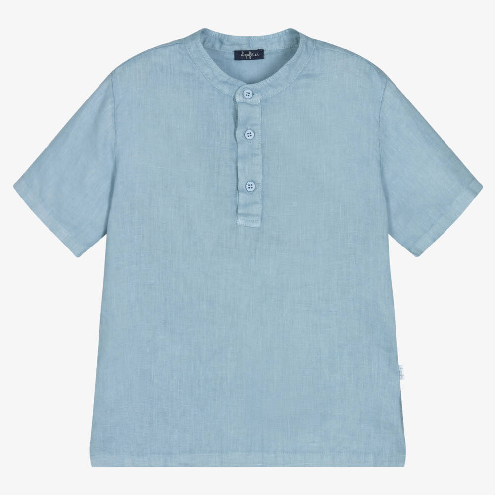 Pale blue shirt for boys from luxury Italian brand Il Gufo. Made in lightweight linen, this short-sleeved collarless shirt is ideal for warmer days. It has button fastenings on the front for easy dressing.