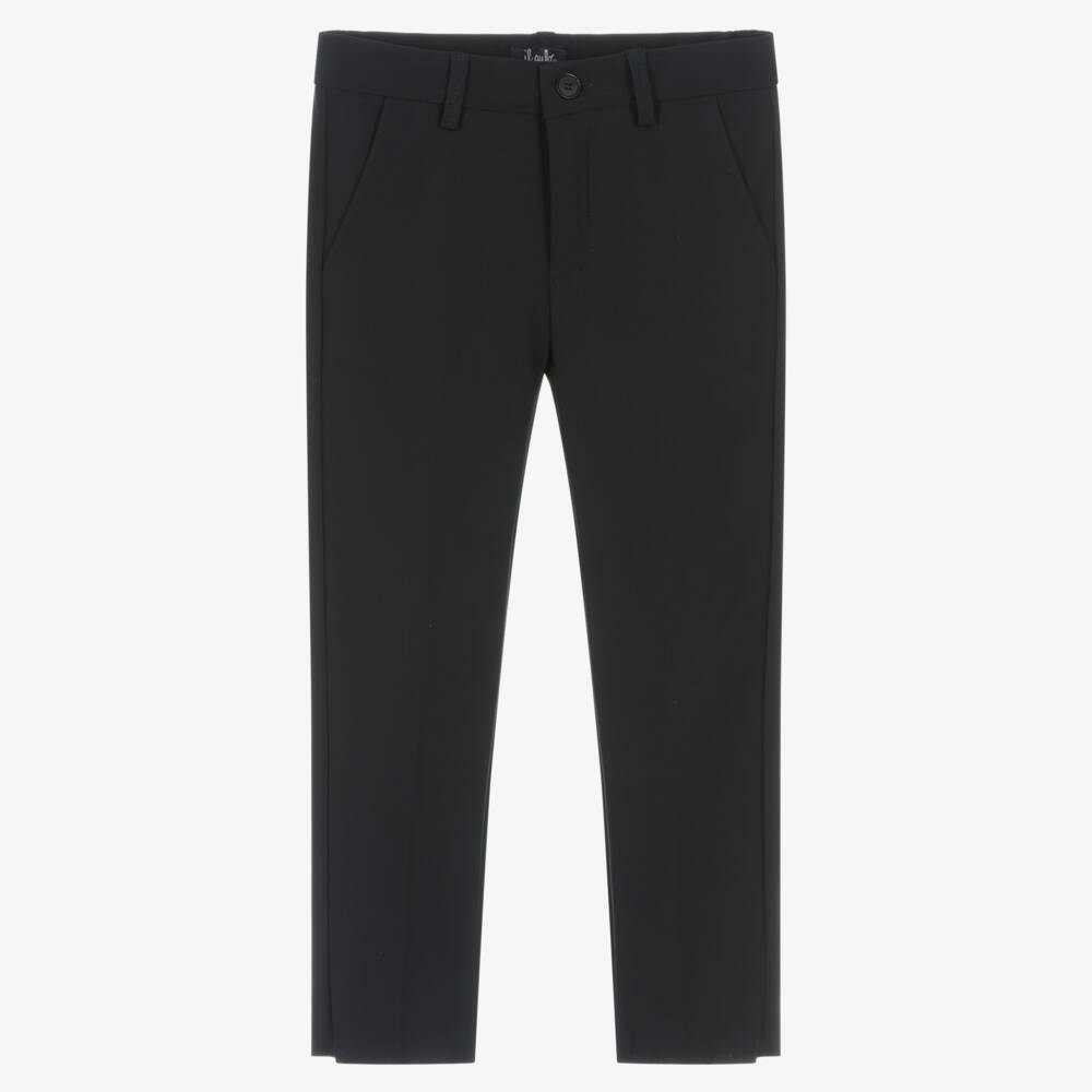 Smart navy blue tailored trousers for boys by luxury, classic Italian designer Il Gufo. Lightweight, stretchy and comfortable, the waistband has useful belt loops and an adjustable waistband for a great fit. They are made in long lasting, wrinkle free, easy care Sensitive® Fabric and fasten with a front button and zip.