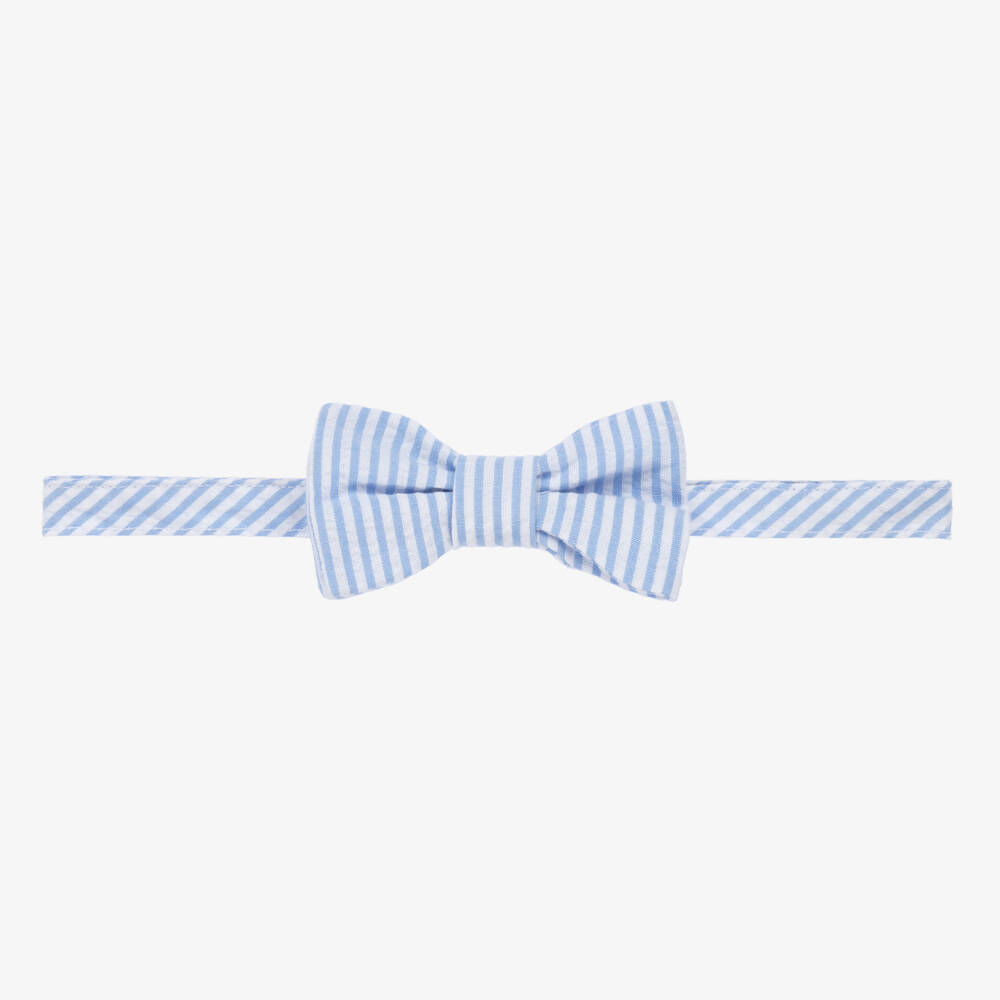 Blue and white striped bow tie for boys from luxury brand Il Gufo. Made in lightweight cotton seersucker, it has an easy-to-use velcro strap that can be adjusted for a better fit.