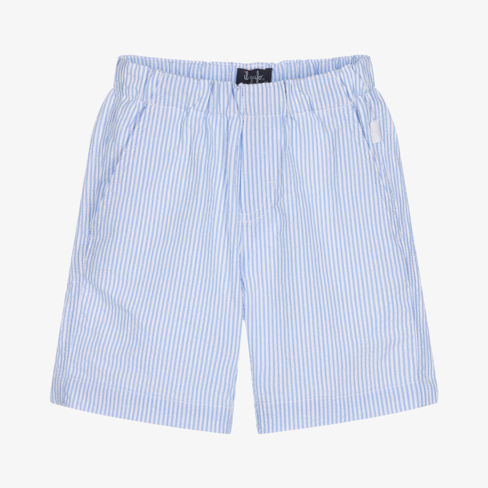 Gorgeous blue and white striped shorts for boys by luxury Italian brand, Il Gufo. Woven in soft and lightweight cotton seersucker, they have slanted front pockets and a single back pocket. There is a subtle logo tab on the side seam for a discreet designer detail. A stretchy, elasticated waist promises maximum comfort on this smart-casual style.