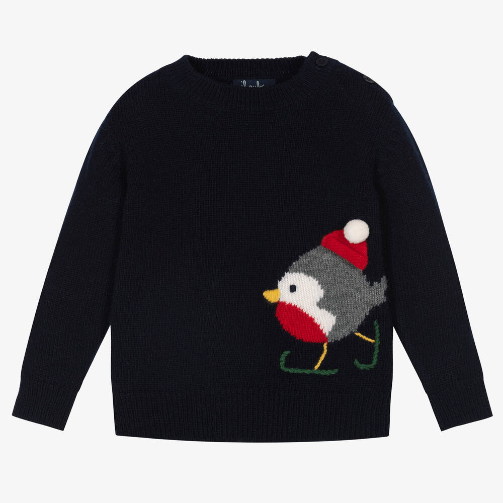 Little boys gorgeous navy blue sweater by luxury Italian brand, Il Gufo. Knitted from the finest Merino wool yarn, which is ethically sourced and environmentally friendly, this warm and cosy jumper has a cute festive robin motif on the front, with buttons on one shoulder for easy dressing.