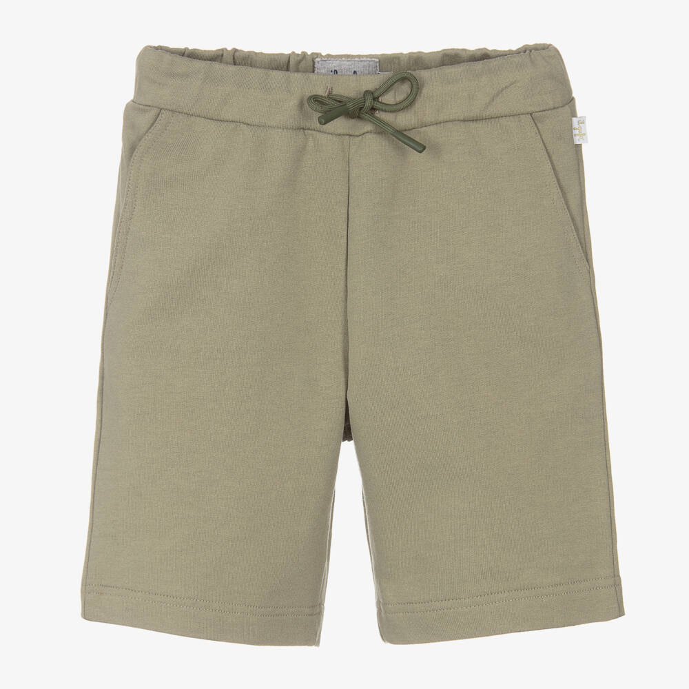 Khaki green cotton shorts for boys from luxury Italian brand Il Gufo, made from soft sweatshirt jersey. This everyday casual style features two slanted front pockets, a patch pocket on the back and a drawstring on the gently elasticated waist for improved fit.