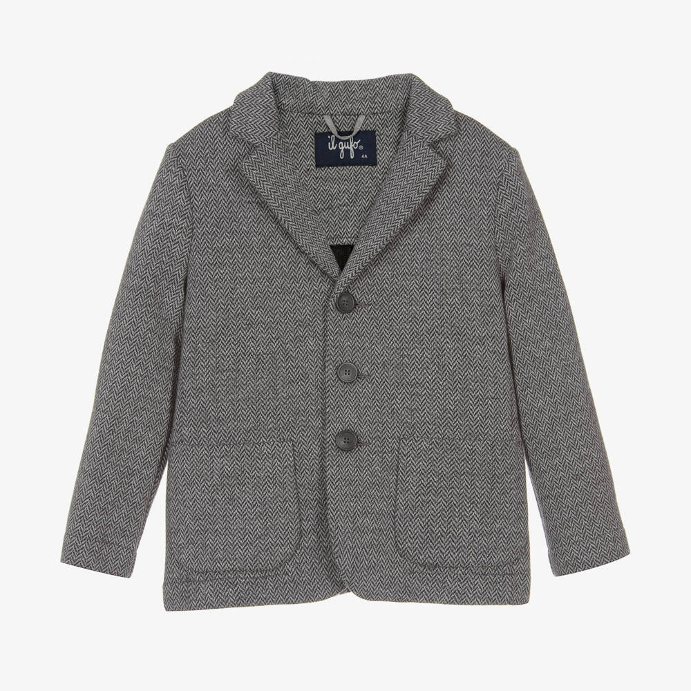 Grey herringbone blazer for boys by luxury Italian brand Il Gufo. Styled in soft, knitted cotton jersey with a slight stretch, this tailored blazer is both smart and comfortable to wear. It has button fastenings on the front, front patch pockets and a double vent on the back for ease of movement.