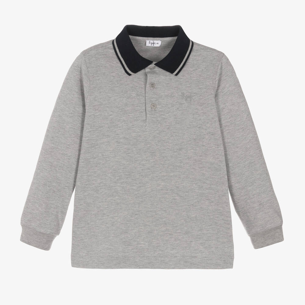 A grey marl cotton long-sleeved polo shirt for boys, by luxury Italian brand Il Gufo. Made in comfortable jersey, it is styled with a navy blue ribbed collar for smart contrast and has button fastenings on the front. An embroidered tonal logo on the chest adds a discreet designer finish.