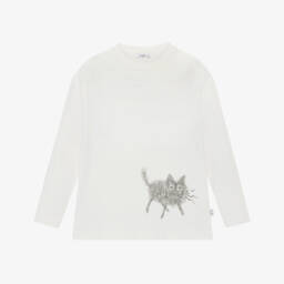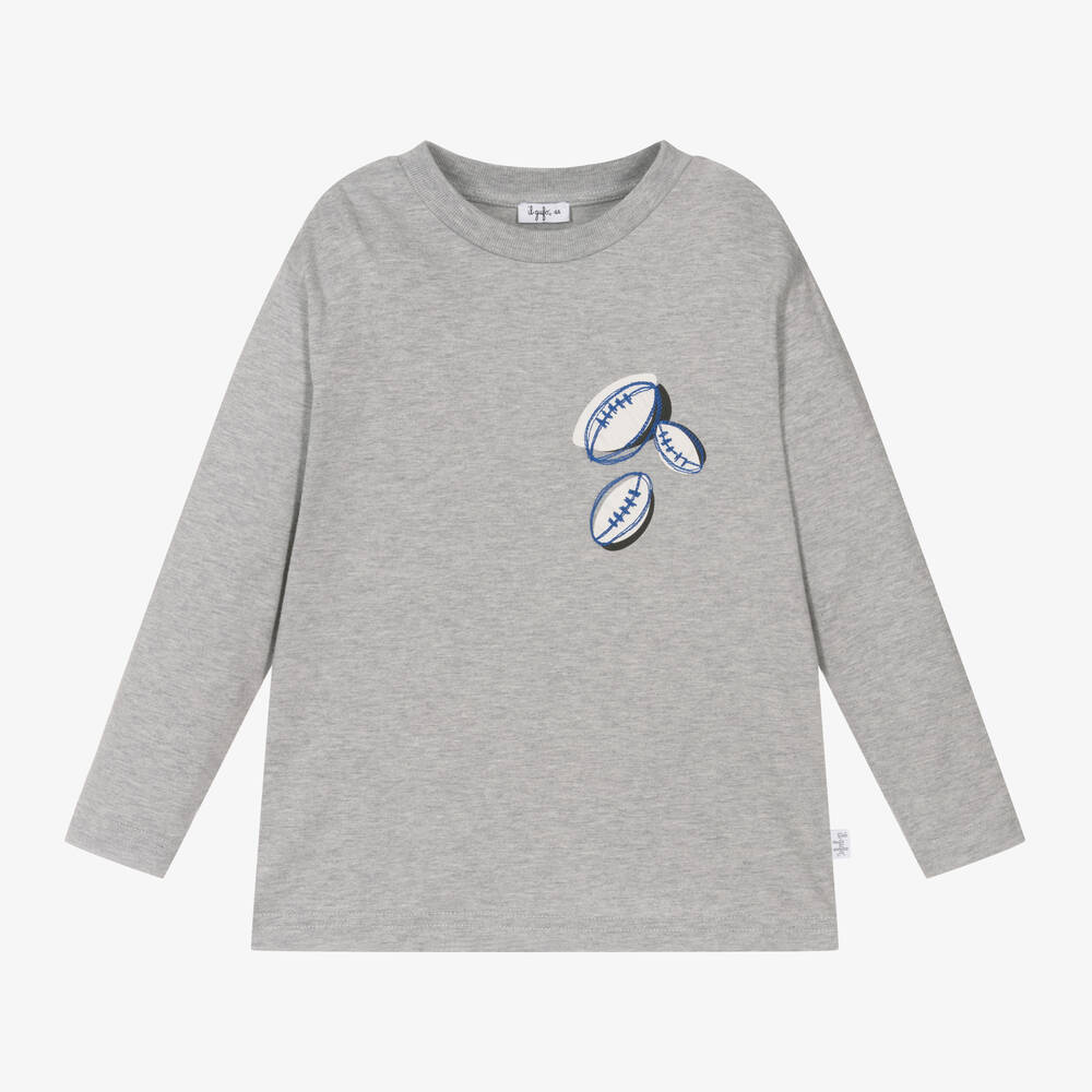 A grey marl long-sleeved top for boys by luxury Italian brand Il Gufo, made in soft and stretchy cotton jersey. This casual top has a ribbed crew neck, a cool American football motif with blue embroidery on the chest and a little logo tab on one side.
