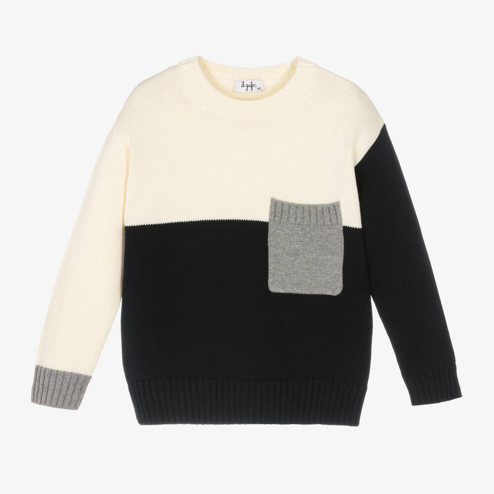 Boys long-sleeved sweater by luxury Italian brand Il Gufo, with an ivory and navy blue colourblock design. Ideal for colder days, it is knitted in soft organic cotton. It has chunky ribbed trims for an extra cosy feel, with a pastel green chest pocket and cuff adding a cool, contrasting look.