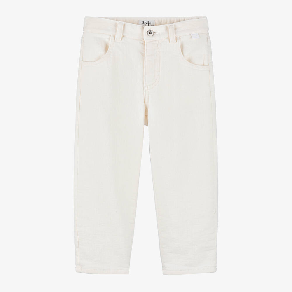 Ivory jeans for boys by luxury Italian brand Il Gufo, made in soft and comfortable jersey denim. Designed in a four-pocket style, they have an adjustable waistband for an ideal fit, with a button and zip fastening on the front. A tonal logo tab on the front adds a finishing designer touch.