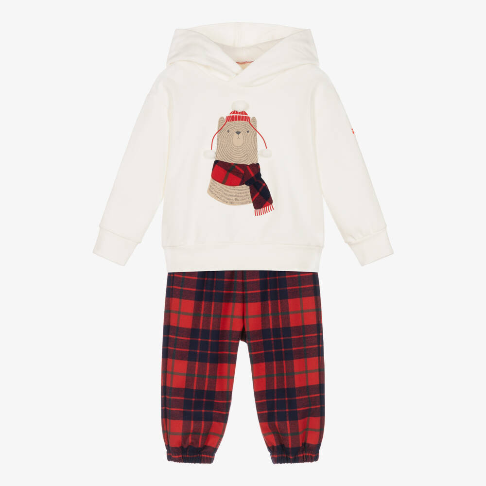 Cute ivory and red checked tracksuit for little boys by luxury brand Il Gufo. The hooded jersey top has an adorable bear printed on the front wearing a hat with 3D pom-poms and a checked scarf appliqué for a fun finish. The red checked trousers are super soft and have an elasticated waist and ankles for comfortable wear.