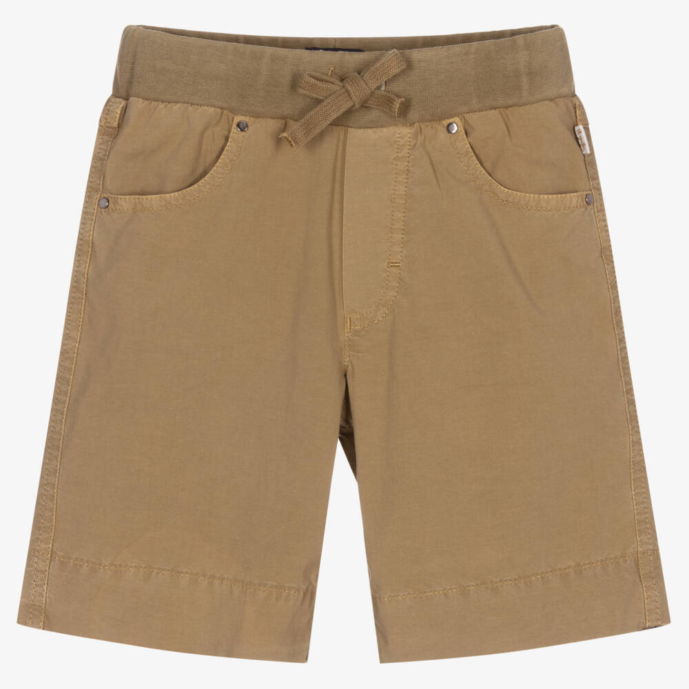 Khaki green shorts for boys by Il Gufo, made in beautifully lightweight cotton poplin. Comfortable to wear, they have a lightly elasticated drawstring cotton jersey waistband. There are useful front and back pockets and a small branded tab on one side.