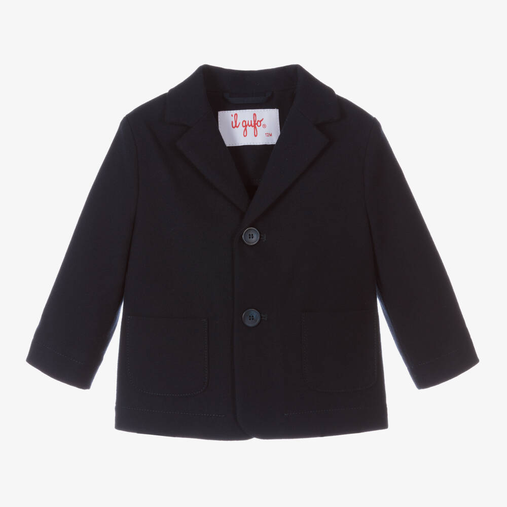 A navy blue blazer for little boys by luxury brand Il Gufo, softly woven in a lightweight viscose blend. This single-breasted blazer has neat button fastenings and patch pockets on the front for smart styling.