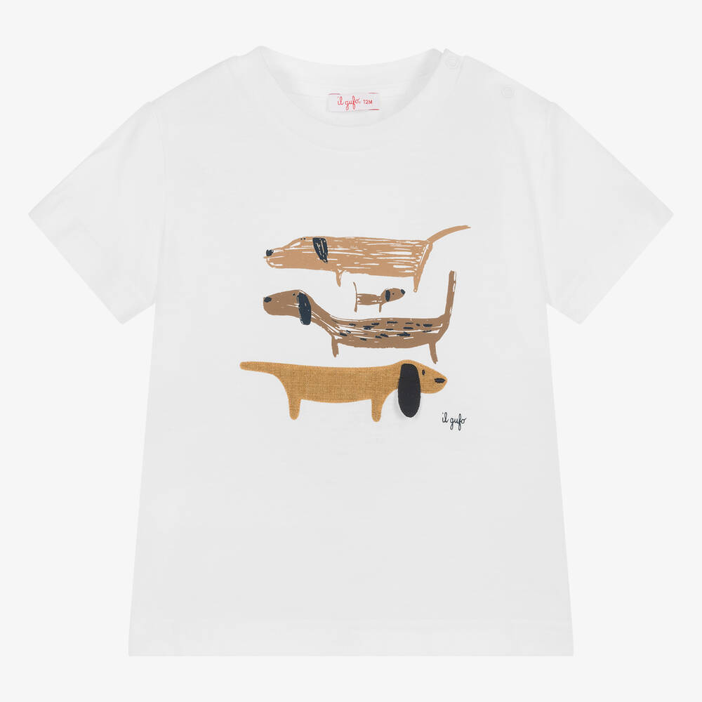 Adorable white cotton short-sleeved T-shirt for little boys by luxury Italian designer Il Gufo. It has brown dachshunds printed and appliquéd on the front, with a black logo below. Made in comfortable jersey, it has popper fastenings on one shoulder for speedy dressing.