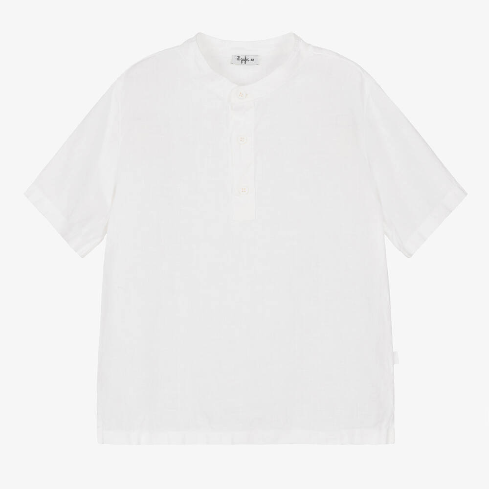 Classic white collarless linen shirt for boys by luxury Italian designer Il Gufo. Cool and lightweight, it has short sleeves, a half-placket that fastens with buttons, and side vents on the hemline for a relaxed and casual look.