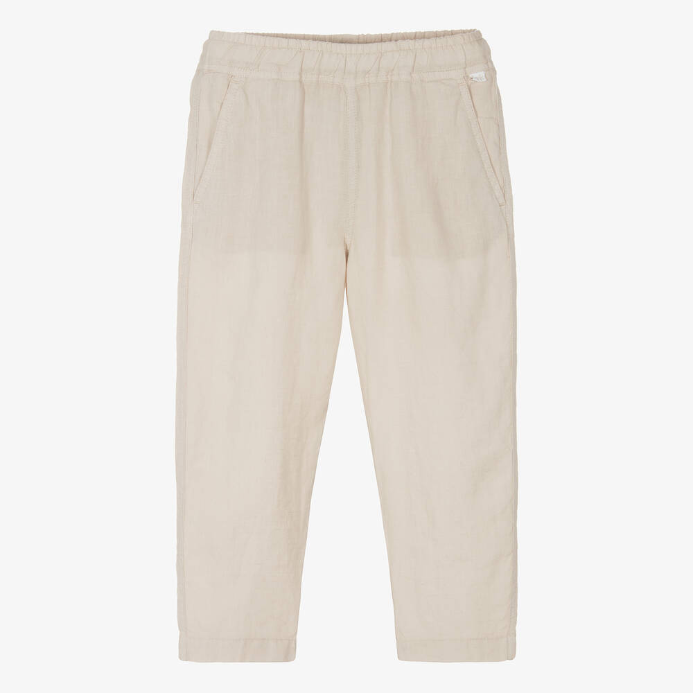 Beige linen trousers for girls from luxury brand Il Gufo, with a subtle logo tab. Great for warm weather, they are woven in pure linen, a fabric prized for its naturally soft and breathable qualities. They are designed in a stylish tapered fit, with front pockets and concealed inner drawstrings on the elasticated waist.