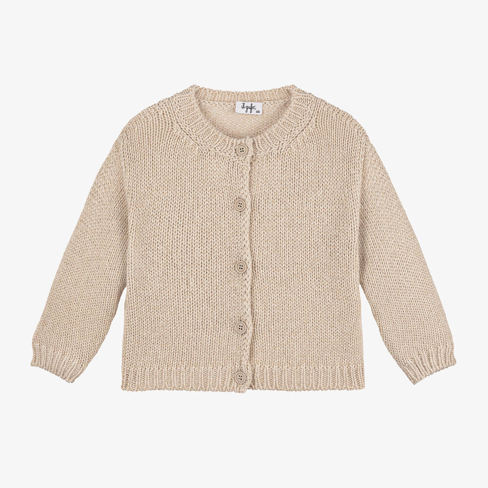 A lovely beige cardigan for girls by luxury Italian brand Il Gufo, knitted in a soft viscose and wool blend with ribbed detailing. Made in Italy, this warm layering piece is woven with fine, metallic gold thread which gives the garment a gentle shimmer. It is styled with a round neckline, a straight hem and dropped shoulder seams. It fastens neatly on the front with round buttons.