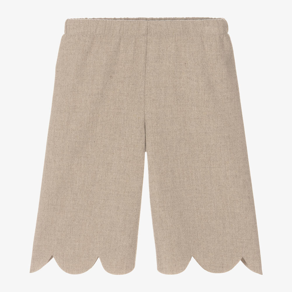 Lightweight and comfortable, these beige trousers for little girls are by Italian luxury brand Il Gufo. They are made in a soft viscose blend, with a gently elasticated waist for easy pull-on. The hems are scalloped for a stylish finish.