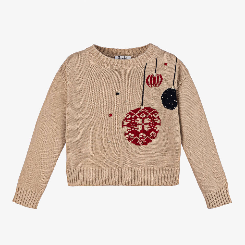Beige sweater for girls by luxury Italian brand Il Gufo, knitted in beautifully soft wool. Lovely for the festive season, the front features red and black baubles, with sparkly gold detailing. Cosy and comfortable, this long-sleeved jumper has a crew neckline and ribbed trims.