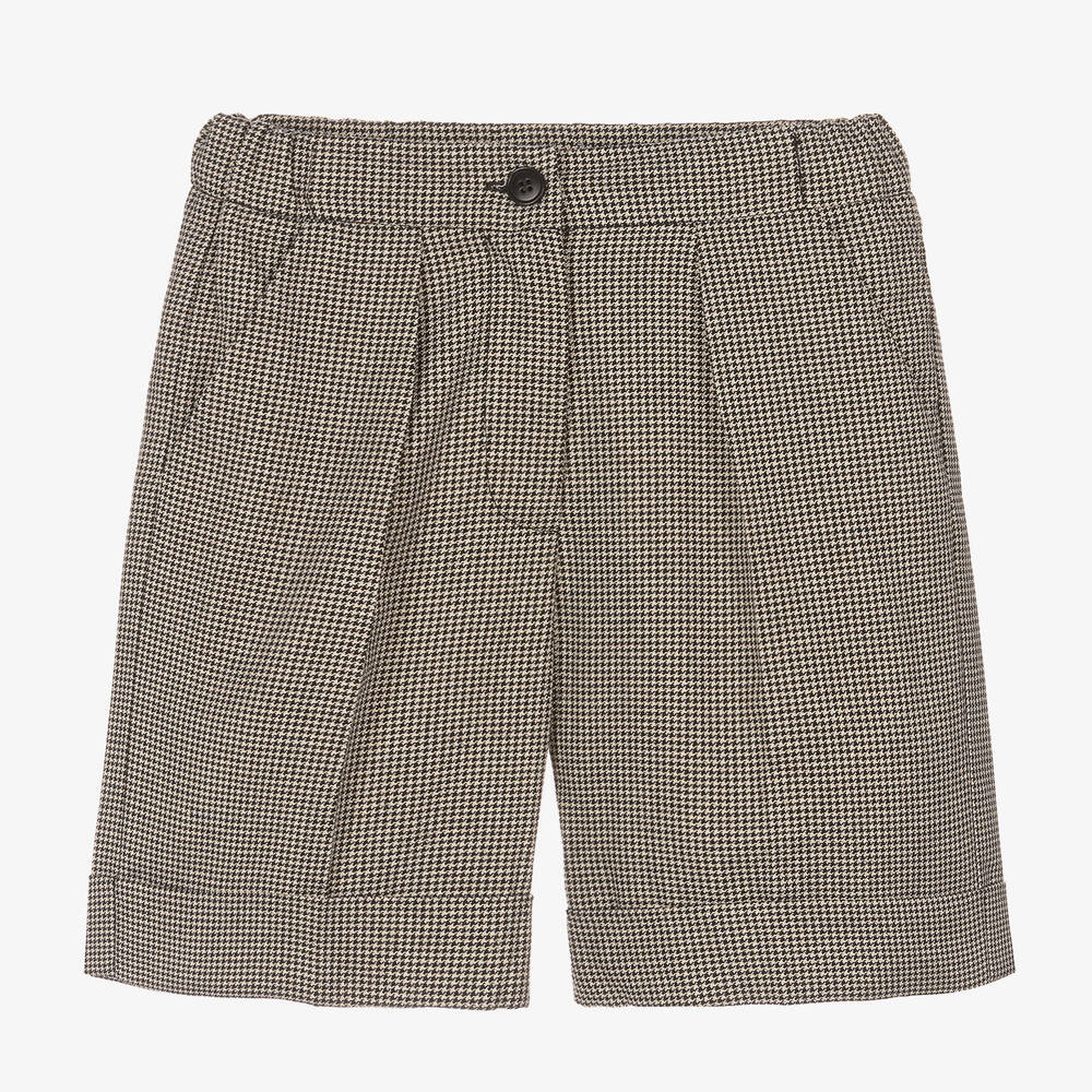 Smart Bermuda shorts for girls by luxury Italian brand Il Gufo. They are woven in a black and beige houndstooth check, with a metallic gold thread for a touch of shimmery sparkle. Lined in silky fabric, these elegant shorts are pleated on the front and have fixed turn ups. They are comfortably elasticated at the back of the waist, with a button and zip fastening on the front, and slanted front pockets to finish.