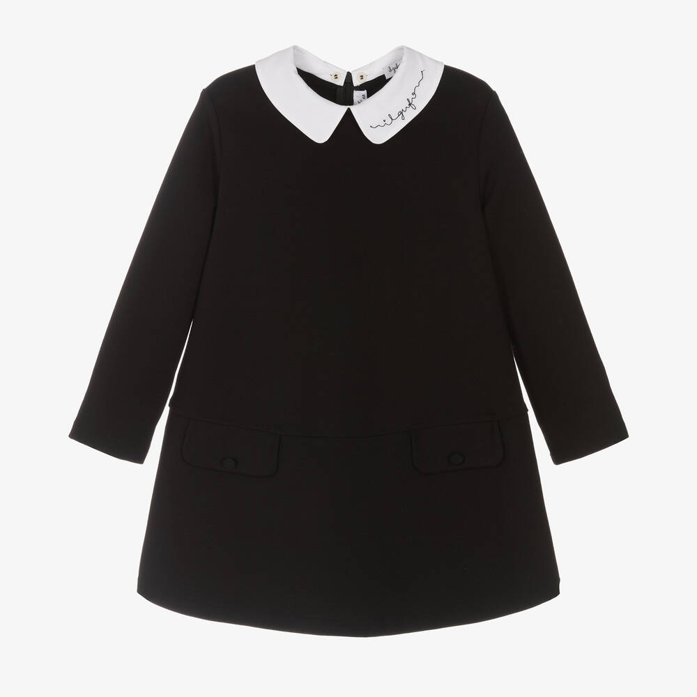 Black dress for girls by luxury Italian brand Il Gufo, made in soft Milano jersey. Casual, but elegant, this classically styled dress has a dropped waist with faux pockets on the front. For versatile wear, it has a removable white cotton collar embroidered with the brand's name in black, which attaches with buttons. It fastens neatly on the back with a concealed zip.